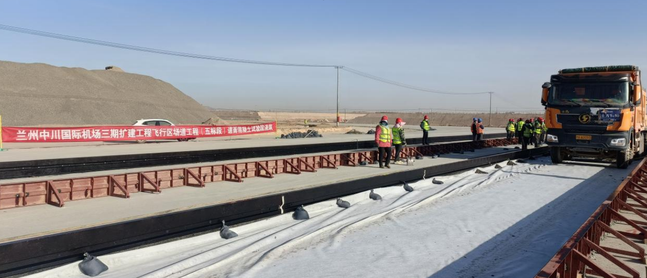 4月20日,由我司承建的蘭州中川國(guó)際機(jī)場(chǎng)三期擴(kuò)建工程飛行區(qū)場(chǎng)道工程(五標(biāo)段)道面混凝土試驗(yàn)段正式開(kāi)倉(cāng)澆筑。
