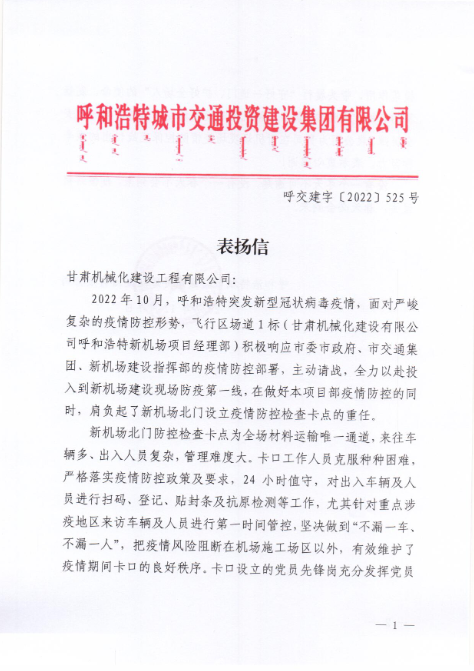 2022年12月7日,呼和浩特市交通投資建設(shè)集團有限公司給我司發(fā)來表揚信,表揚信中充分肯定了我司呼和浩特新機場項目部在疫情防控工作上作出的努力,展現(xiàn)了我司的社會責(zé)任與擔(dān)當(dāng)。