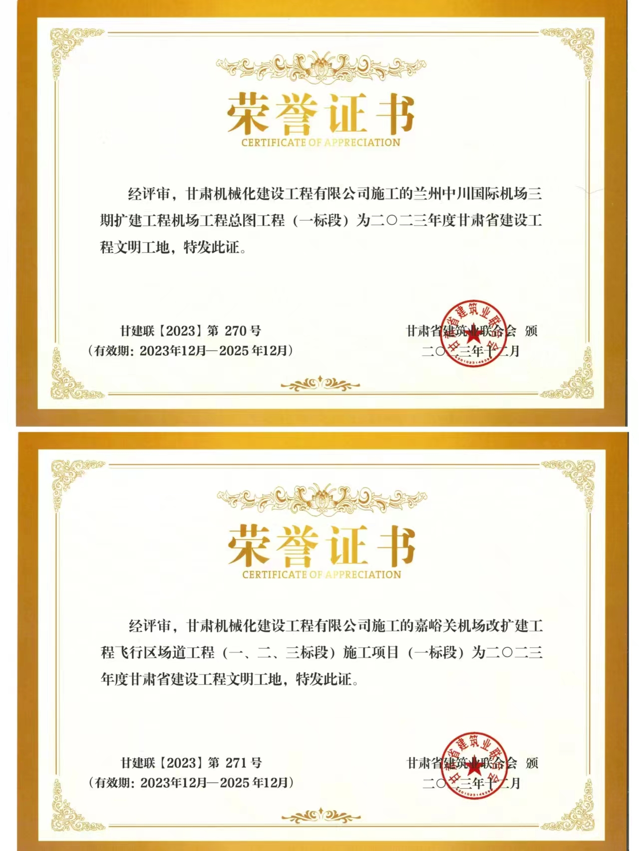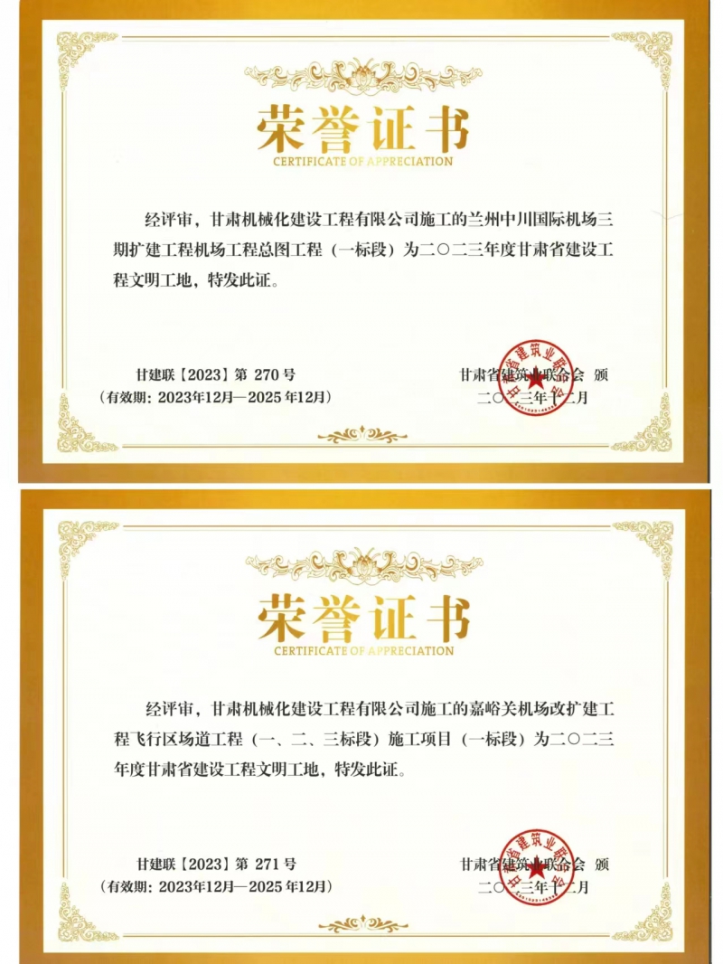 近日,我司承建的蘭州中川國際機場二期擴建工程機場工程總圖工程 (一標段)與嘉峪關機場改擴建工飛行區場道(一、二、三標段) 施工項目 (一標段) 獲得2023年度甘肅省建設工程文明工地榮譽稱號。
