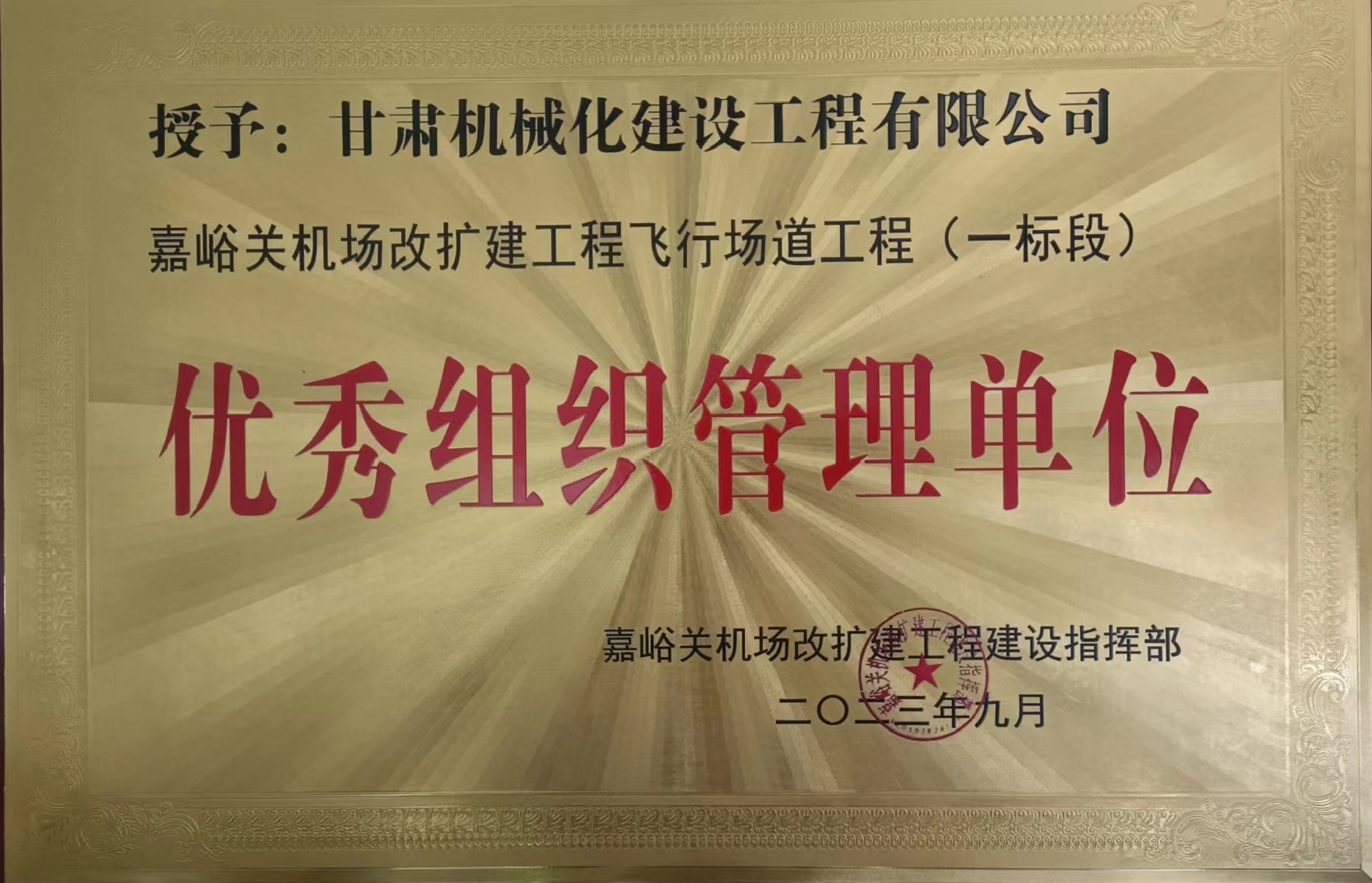 嘉峪關機場改擴建工程飛行場道工程 (一標段)優(yōu)秀組織管理單位